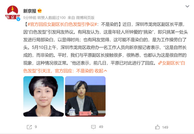 另据新京报报道,龙岗区政府办一名工作人员表示,“这是自然长成的,而非染的。平时,我们与平原副区长接触很多,很熟悉,也都认为这是很自然的现象,这种情况很正常。”