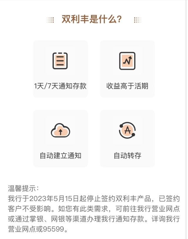 农业银行App显示,该行存款专区中的智能通知存款产品“双利丰”于5月15日起停止签约,已签约客户不受影响。农行表示,如有此类需求,可前往营业网点或通过掌银、网银等渠道办理通知存款。
