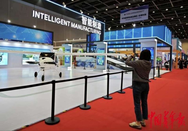 一名观展人在智能制造展区拍摄展出的斯洛文尼亚蝙蝠飞机。中青报·中青网见习记者 朱彩云/摄
