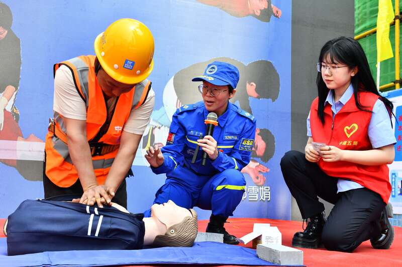 “轻拍患者双肩并呼唤,判断患者是否有意识;高声呼救并拨打120求救......”活动现场,志愿者一边讲解一边演示心肺复苏的操作流程。演示结束后,工人们纷纷上台实操。“师傅,您的手角度不对,力度要再大一点。”志愿者从旁指导,及时纠正不规范的操作,确保人人掌握应急救援技能。