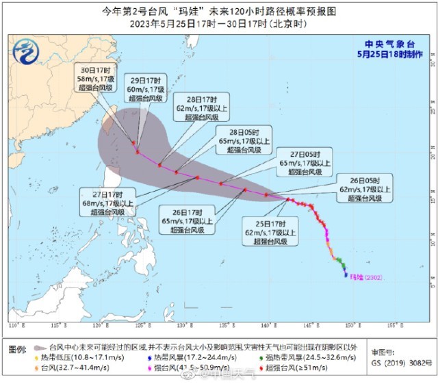 @中国天气 首席气象分析师胡啸解释,5月出现如此强的台风也是正常,毕竟已经五月底了,海水表面温暖,这种远海生成的台风发展空间也大,利于台风加强。预计,“玛娃”将逐渐向菲律宾吕宋岛以东洋面靠近,更温暖的暖水洋面,加上风切更小,将有利于它的持续增强,预计将会在27-28日达到其巅峰强度。