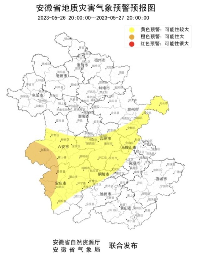 此外,安徽省发布地质灾害预警,5月26日20时—5月27日20时,橙色预警区为:安庆市的岳西县、太湖县、宿松县,六安市的金寨县、霍山县请加强防范,同时做好灾害隐患点上人员转移准备工作;黄色预警区为:六安市市区、舒城县,安庆市市区、怀宁县、望江县、桐城市、潜山市,合肥市的蜀山区、包河区、瑶海区、肥西县、肥东县、庐江县、巢湖市,滁州市市区、全椒县、来安县、天长市,马鞍山市的和县、含山县,芜湖市的无为市、鸠江区,铜陵市的枞阳县、义安区、郊区,池州市的贵池区。