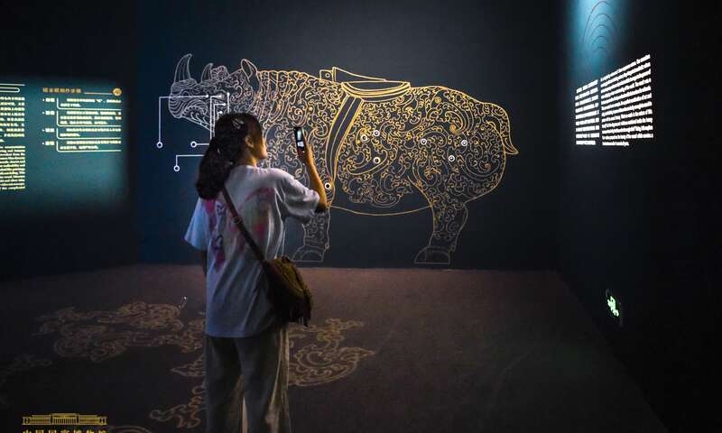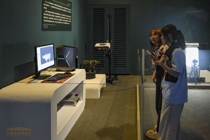 一方面,展览通过数字手段直观呈现文物高清细节和科学研究成果,让观众从单纯的参观者变成探索者、参与者,从视、听、触、互动思考等多维度,深入感受犀尊所承载的价值;另一方面,在展厅内再现文物采集、应用场景和数字运行平台,通过互动设备将数字展厅与陈列原文物的“古代中国”展厅联动起来,使观众的视野从一个展览延伸到多个展览,在感悟历史的同时,切身体会到现代技术带给博物馆的无限可能。