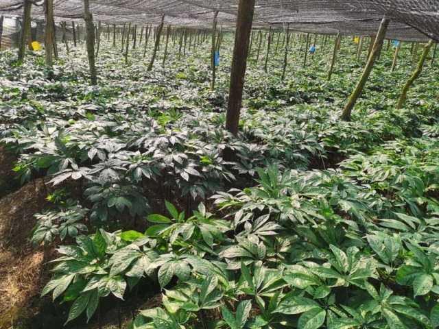 在德厚镇德厚村,采用“垄鑫棉隆土壤熏蒸修复技术”破除连作障碍后种植的三七。(新华每日电讯记者谢锐佳2023年2月12日摄)“直观地说我们是用火烧。”童心三七合作社负责人周枫凌站在马关县三七荫棚里“炫耀”他们的新技术,“你看这块地是第二茬,还长得这么好!”眼前连片的三七茎秆粗大壮实,叶片肥厚油亮,有200多亩。原来,他们另辟蹊径,用物理方法破除三七连作障碍,特定的“火烧”技术可让热量“穿透”地表,深入地下15-20厘米,将导致三七出现根腐病的病害“就地烧灭”。这项技术将三七种植十几二十年的连作间隔时间降为2-5年,目前已申请了专利。