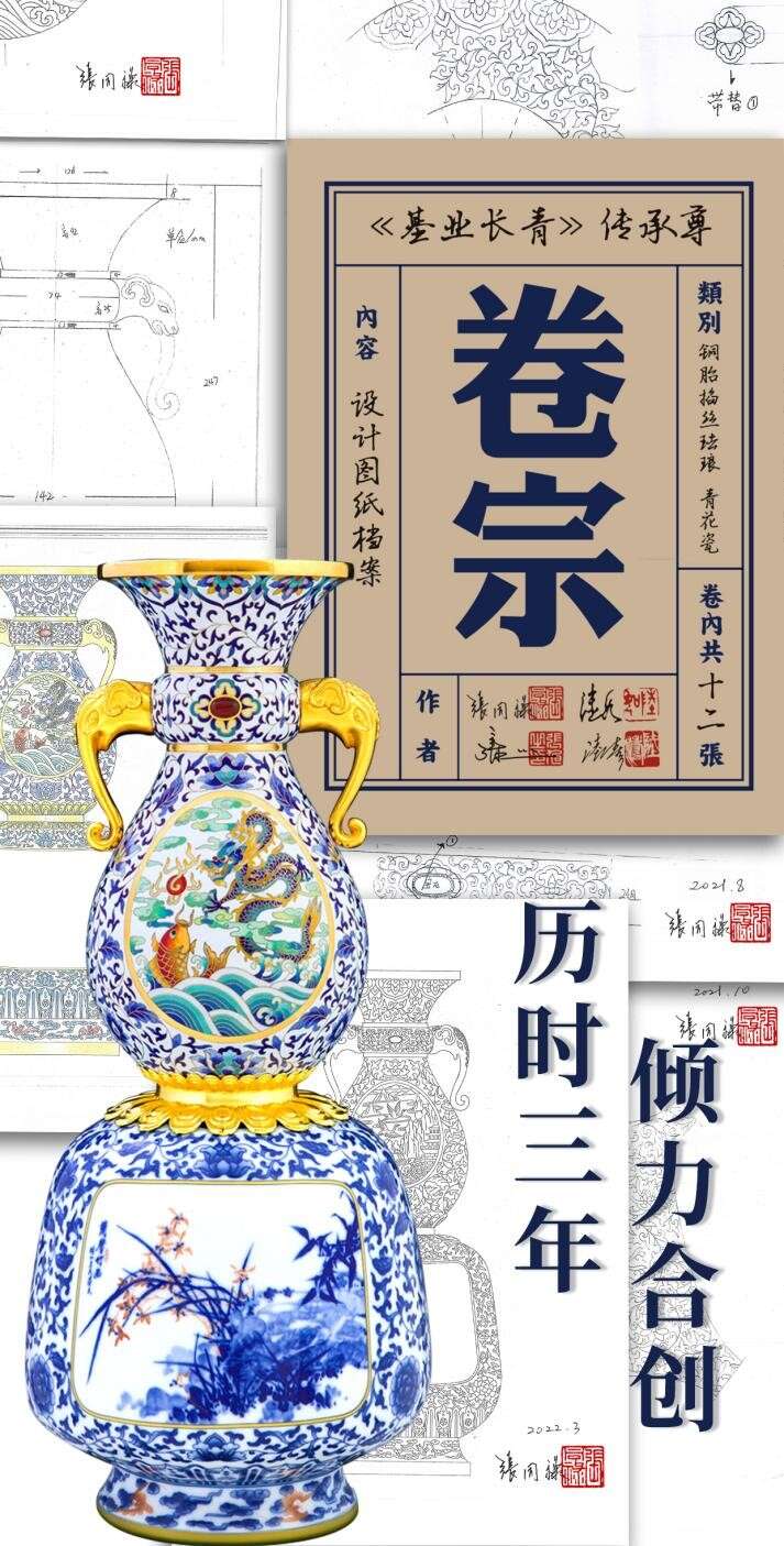 《基业长青》传承尊由景泰蓝“世家”张同?、张旭与青花瓷“世家”陆如、陆涛,跨界联手打造。作品在工艺上大胆突破,首次将青花瓷与景泰蓝合璧,融温润、素雅的青花瓷与高贵、华美的景泰蓝于一体。