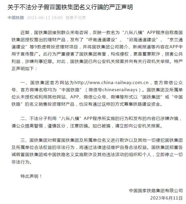 “中国铁路”微信公众号6月11日发布严正声明称,近期,国铁集团接到群众来电咨询,反映一款名为“八纵八横”APP程序自称是国铁集团授权推出的理财产品,发布了“呼南通道建设”、“沿海通道建设”、“京兰通道建设”等9款虚假投资理财项目,并将国铁集团公司简介、新闻报道等内容在APP中用于宣传推广。