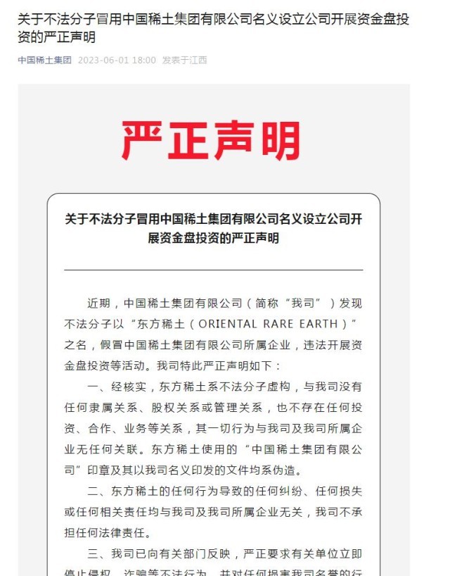 中国稀土表示,经核实,东方稀土系不法分子虚构,与公司没有任何隶属关系、股权关系或管理关系,也不存在任何投资、合作、业务等关系,其一切行为与公司及公司所属企业无任何关联。东方稀土使用的“中国稀土集团有限公司”印章及其以我司名义印发的文件均系伪造。