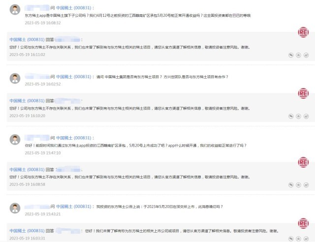 中新财经注意到,有投资者曾在互动平台上向中国稀土询问“东方稀土”相关信息,从提问内容看,可能已有投资者被误导受骗。比如,“东方稀土APP是中国稀土旗下子公司吗?我们4月12号之前投资的江西赣南矿区承包5月20号能正常开通收益吗?”“我投资的东方稀土公告上说:于2023年5月20曰在深交所上市,此消息确切吗?”等等。