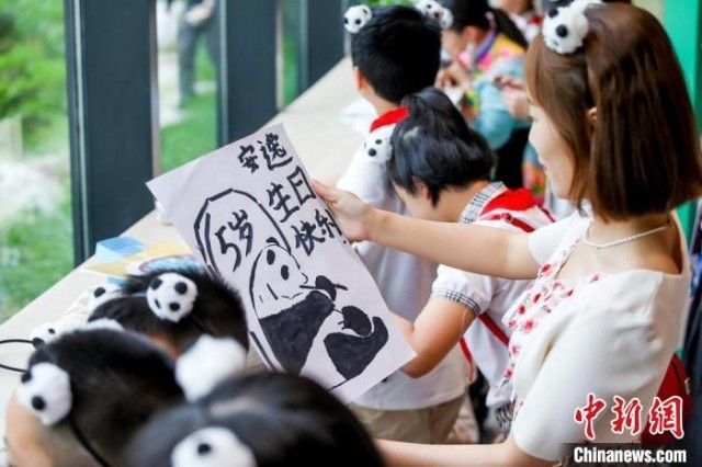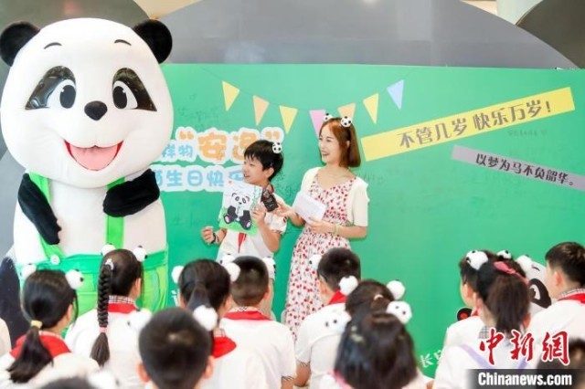 中新网成都6月15日电 (唐倩)6月15日,四川文旅吉祥物大熊猫“安逸”的5岁生日会在成都大熊猫繁育研究基地举行。学生代表以及“安逸”粉丝来到生日会现场,为“大熊猫安逸庆祝。