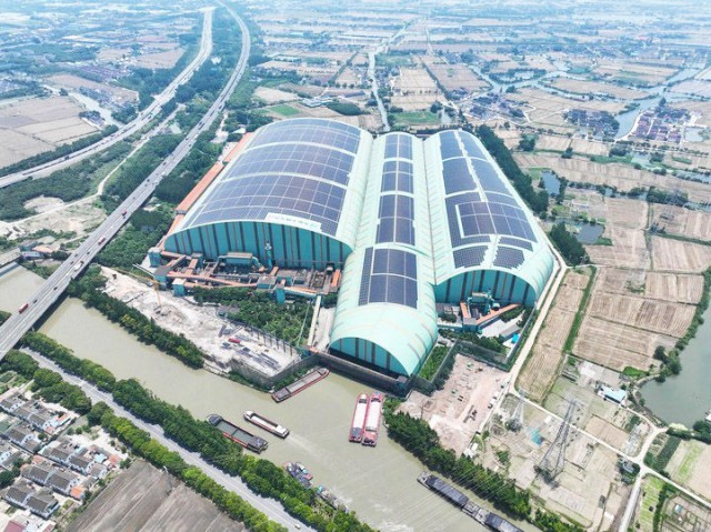 6月9日无人机拍摄的常熟市龙腾特种钢有限公司码头料场屋顶光伏。