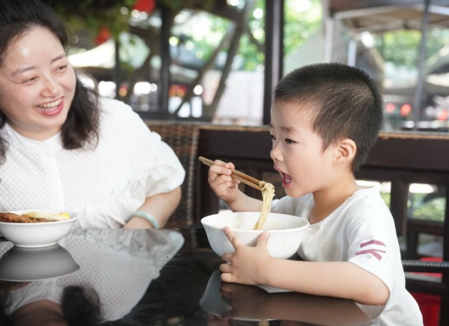 6月9日,小朋友在常熟市望岳楼老面馆品尝蕈油面。