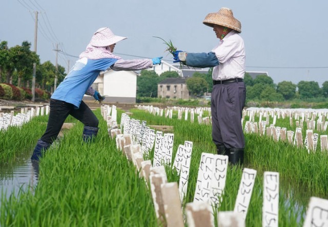 6月6日,常熟市农科所水稻育种专家端木银熙(右)和技术人员一起在秧田拔除杂株,检查秧苗生长情况。
