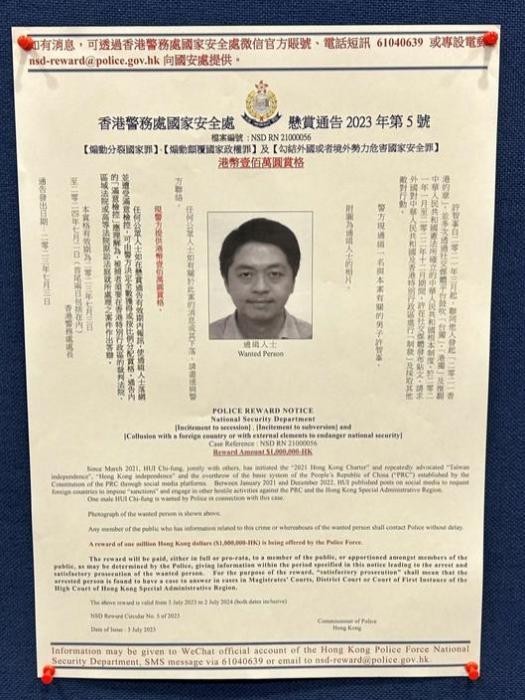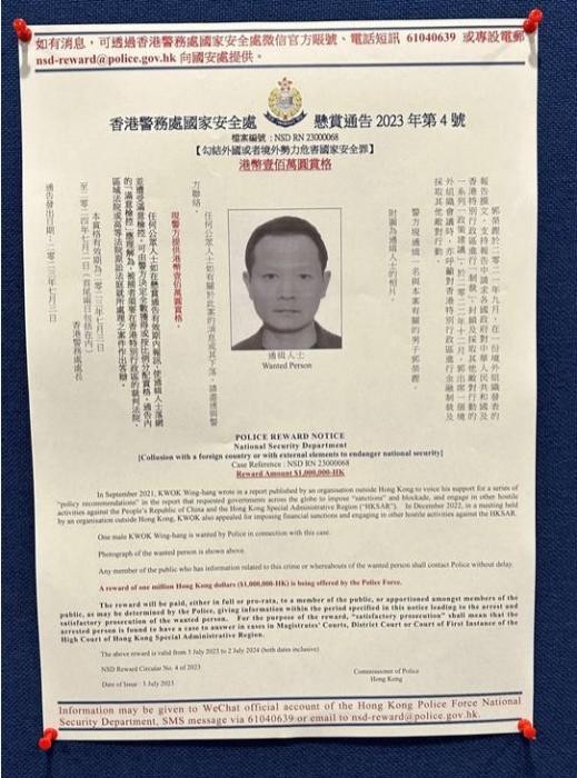 中新网7月3日电 综合港媒报道,香港警务处国家安全处(国安处)今日(3日)下午3时召开记者会,国安处总警司李桂华表示,注意到反中乱港分子逃窜至海外后继续违法,强调香港警方有责任追究。警方早前已通缉8名人士,包括任建峰、袁弓夷、郭凤仪、郭荣铿、许智峯、蒙兆达、刘祖廸、罗冠聪,并每人悬红100万港元。