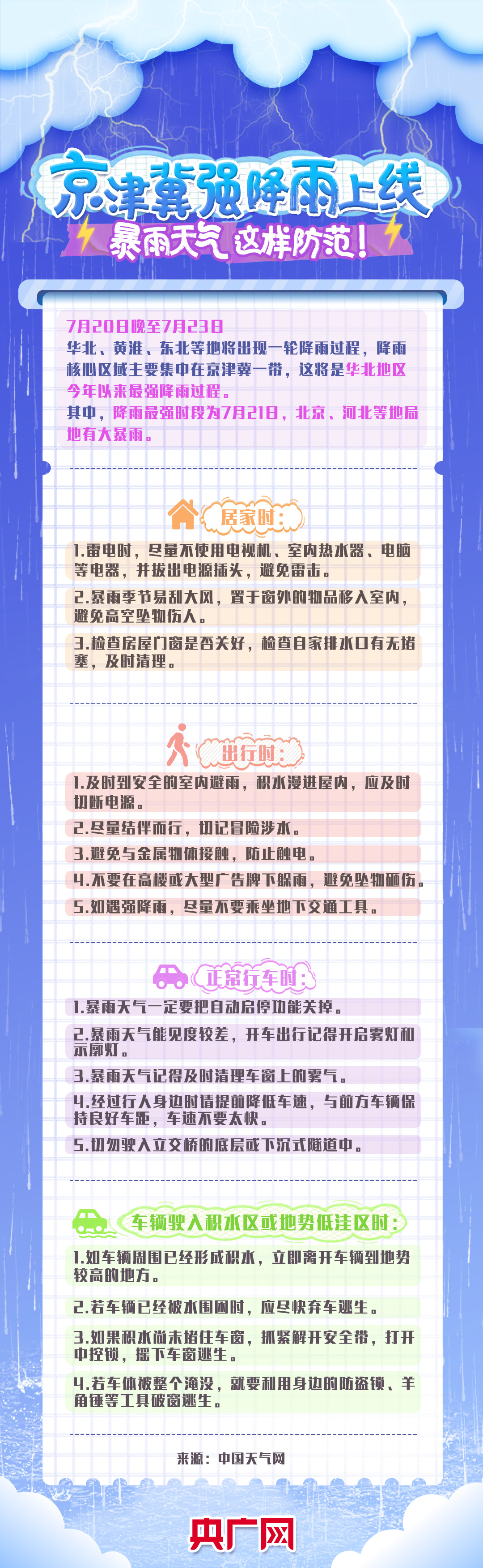 7月20日晚间,一轮强降雨上线,据气象部门预报,本轮降雨将持续至23日,自西向东覆盖河北、北京、天津、山东、辽宁等十余省份,华北地区降雨或为今年来最强。其中,21日为降雨最强时段,北京、河北等地局地有大暴雨。暴雨天气,有哪些安全须知?戳长图,一起了解↓↓