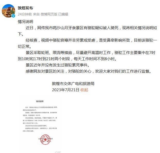 中新网7月21日电 据甘肃省敦煌市外宣办官方微博消息,敦煌市文体广电和旅游局21日发布情况说明称,近日,网传敦煌市鸣沙山月牙泉景区有骆驼疑似被人骑死。