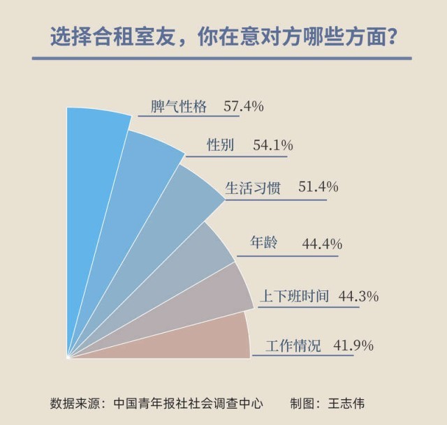 调查中,51.4%的受访者在意室友的生活习惯,44.4%的受访者在意对方的年龄。其他还有:上下班时间(44.3%),工作情况(41.9%),人品(41.5%),兴趣爱好(30.1%),是否养宠物(23.0%),是否有对象(17.5%),学历(10.3%)。