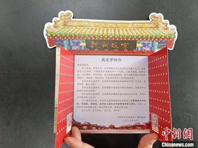 据介绍,此次随录取通知书一并发出的贺信还有五大景区免费门票,是沈阳市文旅局举办的“青春在沈阳”活动的第一项活动,也是沈阳文旅首次面向来沈阳读就的新大学生、研究生、博士生及其家长发出的诚意之邀。贺信的设计以沈阳故宫为元素,“红墙高阙”下,翻开“世界文化遗产之门”,题为《致追梦的你》的贺信将首先映入眼帘。