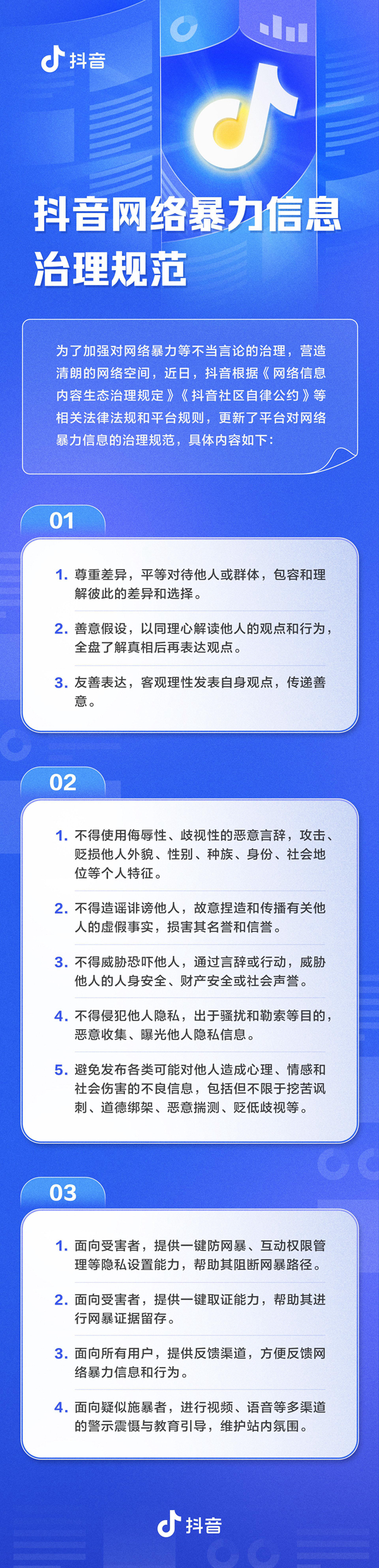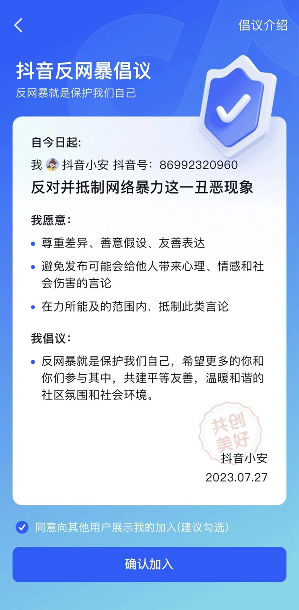 在此次的“反网暴倡议”中,抖音呼吁各界共同“反对并抵制网络暴力这一丑恶现象,尊重差异、善意假设、友善表达;避免发布可能会给他人带来心理、情感和社会伤害的言论;在力所能及的范围内,抵制此类语言”。《倡议》还提到,“反网暴就是保护我们自己,希望更多的你和你们参与其中,共建平等友善、温暖和谐的社区氛围和社会环境”。