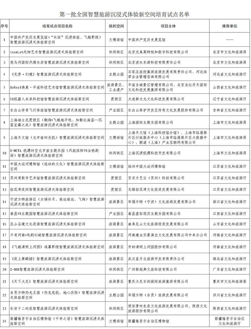 中国青年报客户端讯(中青报·中青网记者夏瑾)8月3日,文化和旅游部发布通知,公布第一批全国智慧旅游沉浸式体验新空间培育试点名单。该名单根据《文化和旅游部办公厅关于开展智慧旅游沉浸式体验新空间推荐遴选暨培育试点工作的通知》(办资源发〔2023〕50号),在自愿申报、省级文化和旅游行政部门推荐的基础上,经专家评审、向社会公示后确定。名单包括亮马河国际风情水岸智慧旅游沉浸式体验空间、拈花湾夜间智慧旅游沉浸式体验新空间等24个依托休闲街区、度假区、文博场馆、主题公园、工业遗产培育的试点项目。