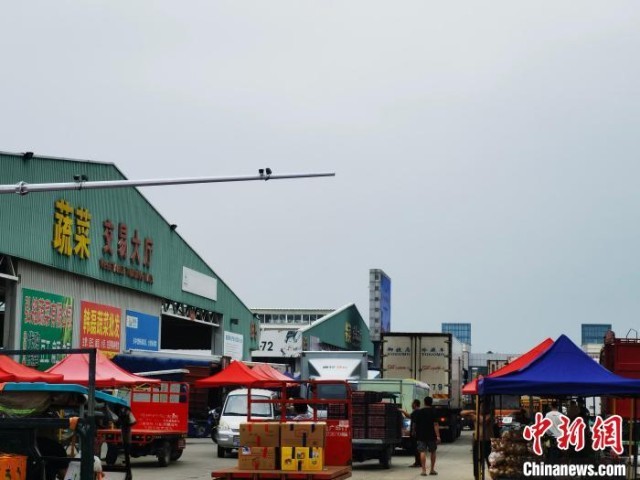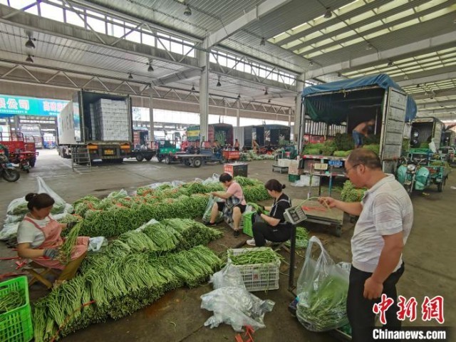 中新网保定8月4日电 (吕子豪 徐巧明)8月4日,中新网记者在有京津冀“菜篮子”之称的首衡高碑店国际农产品交易中心(以下简称首衡高碑店市场)蔬菜大厅门前看到,运货车辆形成“拥堵”,道路两侧摆满茄子等蔬菜批发摊位。