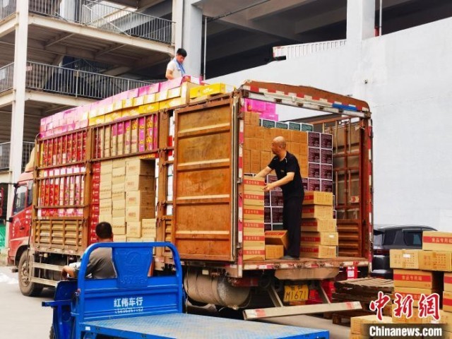 图为涿州村民郎振兴(左一)把成箱的方便面等货品装车。吕子豪摄