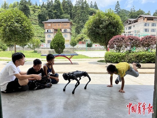 孩子们在苏州大学支教同学的指导下操作机器狗。李超/摄