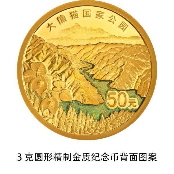 大熊猫国家公园3克圆形金质纪念币背面图案为大熊猫国家公园自然景观,并刊“大熊猫国家公园”字样及面额。
