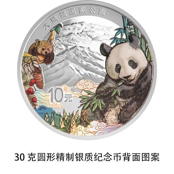 大熊猫国家公园30克圆形银质纪念币背面图案为大熊猫、小熊猫、珙桐等元素装饰组合设计,衬以大熊猫国家公园自然景观,并刊“大熊猫国家公园”字样及面额。
