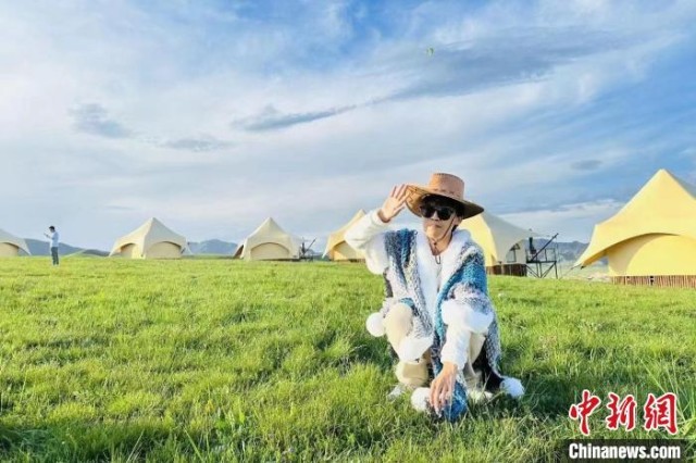 2023年6月,来自台湾的“Z世代”旅游博主刘宝在甘肃省甘南藏族自治州的桑科草原旅行。(受访者供图)