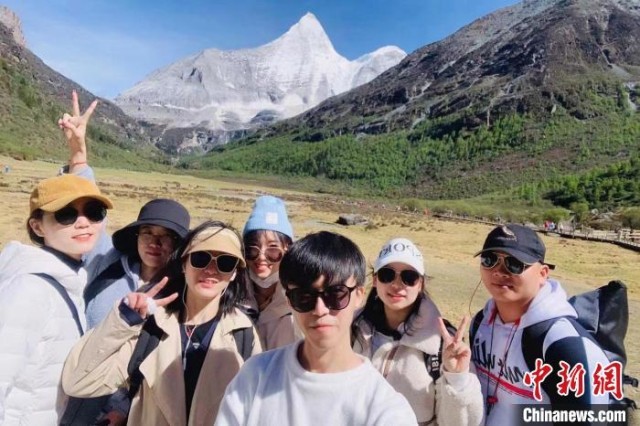 2021年5月,来自台湾的“Z世代”旅游博主刘宝(右三)在稻城亚丁与朋友们合影。(受访者供图)