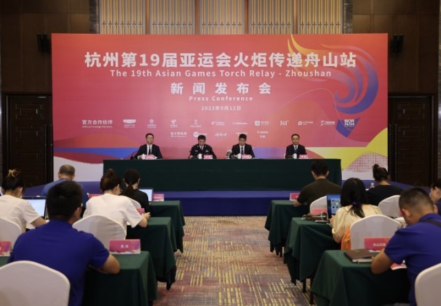 9月12日,杭州第19届亚运会火炬传递舟山站新闻发布会举行,介绍了有关筹备工作情况。 记者 孙潇娜 摄