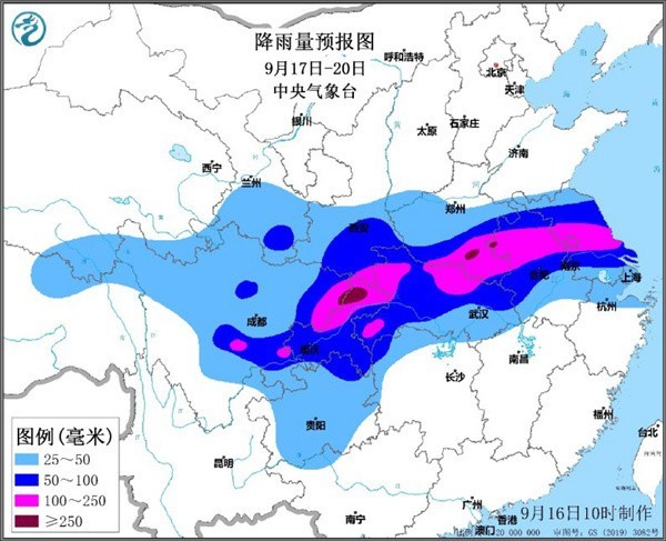 中央气象台预计,17日至20日,陕西南部、四川盆地、江汉、黄淮南部、江淮等地自西向东将有大到暴雨,其中陕西南部、四川东北部和南部、重庆北部、湖北西部和北部、河南南部、安徽中北部、江苏中北部等地部分地区有大暴雨,重庆北部局地有特大暴雨。上述地区累计降雨量40~80毫米,部分地区100~180毫米,重庆北部、河南东南部、安徽西部等局地250~300毫米。