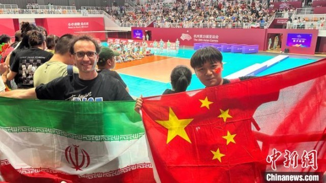 26日晚的男排决赛中,中国队与伊朗队相遇。在观众席,一位伊朗观众不断挥舞国旗,为球队加油助威。他是侯赛因,在浙江绍兴定居已有五年。
