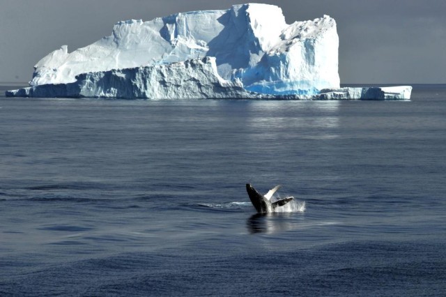 一只鲸鱼在罗斯海的一座冰山脚下露出海面。新华社记者 张建松 摄
