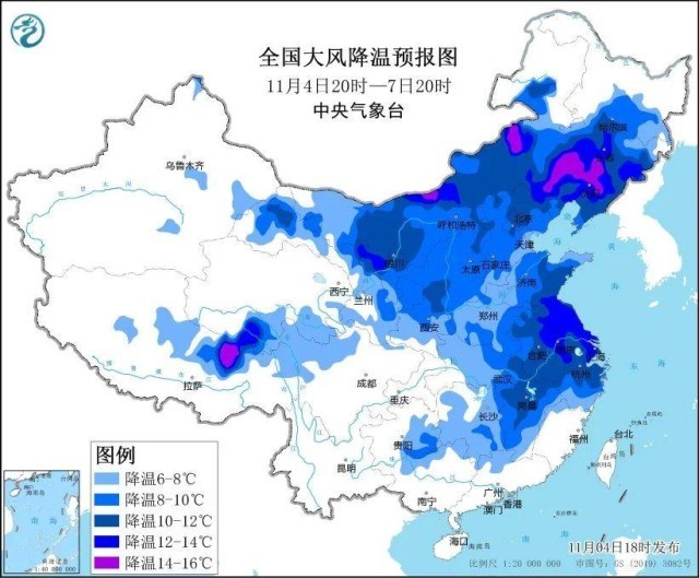 预计,4日20时至7日20时,西北地区中东部及中东部大部地区气温将下降6~10℃,其中,内蒙古中部和东部、东北地区中南部、江淮中东部等地部分地区气温将下降12~14℃,吉林西南部、辽宁西北部、内蒙古东南部等地局地降温可达16℃以上;最低气温出现在7日早晨,最低气温0℃线将位于河北北部、北京南部、山西南部至陕西关中平原、甘肃东南部一带,长江中下游沿江大部地区最低气温将降至10℃左右。长江中下游以北地区有4~6级偏北风,阵风7~9级,局地可达10级。