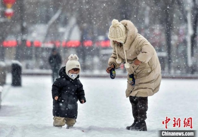 11日,新疆乌鲁木齐市迎来一场降雪,气温骤降。图为市民带着孩子在雪中玩耍。 刘新 摄