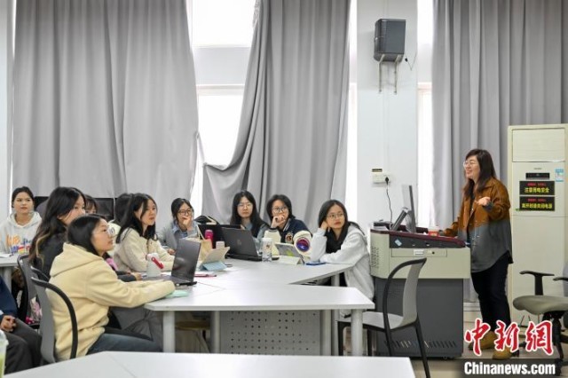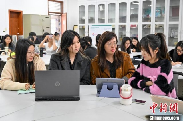 近日,谢雅卉(右一)与同学们在课堂上讨论广告设计内容。中新社记者 陈骥旻 摄