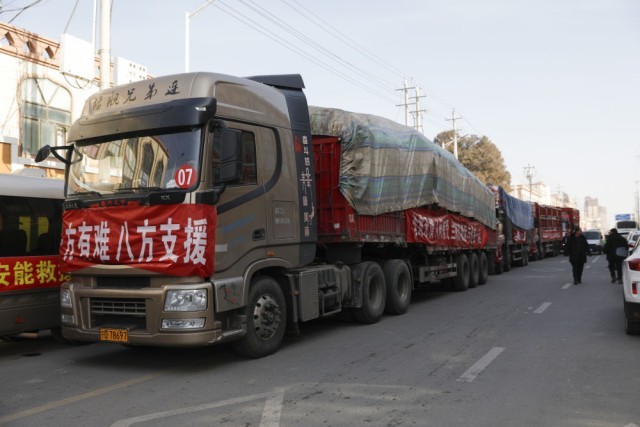 12月20日,在积石山县大河家镇大河村安置点外,救援物资等待卸货。新华社记者 方欣 摄