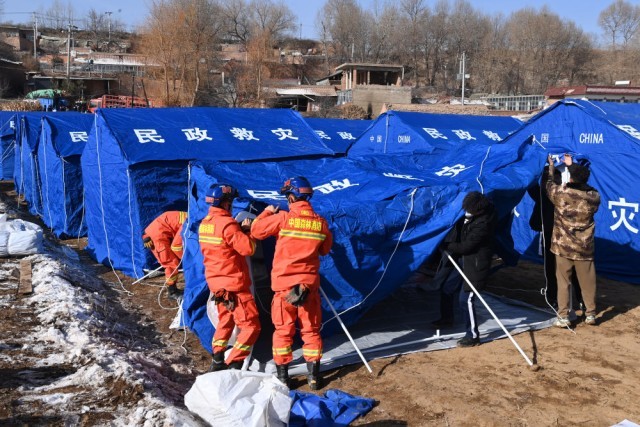 12月20日,在积石山县石塬镇沈家坪村安置点,救灾人员为受灾群众搭建帐篷。新华社记者 范培珅 摄