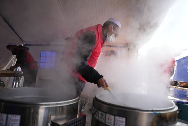12月20日,在积石山县大河家镇大河村安置点,爱心企业的工作人员为受灾群众制作免费牛肉面。新华社记者 陈斌 摄