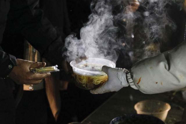 12月19日晚,在积石山县大河家镇大河村安置点,受灾群众领取爱心牛肉面。新华社记者 方欣 摄