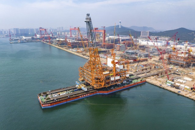 7月10日,渤中19-6凝析气田Ⅰ期项目中心平台在青岛成功装船,即将奔赴渤海西部海域,进入海上安装和联调阶段(无人机照片)。