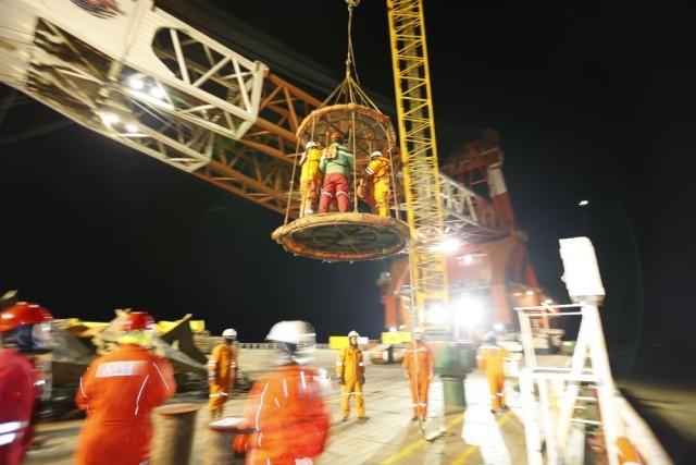 12月17日,在渤海海上平台作业海域,建设者乘吊笼上运输船准备前往施工现场。