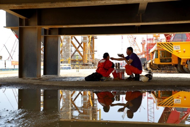 7月9日,工人在渤中19-6气田Ⅰ期项目中心平台作业现场施工,脸上挂满汗珠。