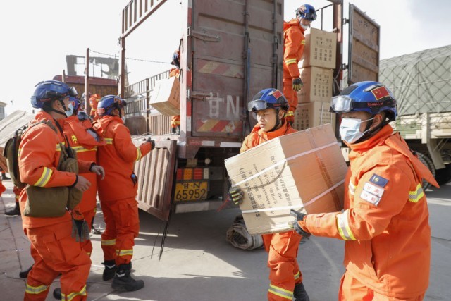12月19日,在甘肃临夏积石山县大河家镇大河村安置点,消防人员在搬运救援物资。新华社记者方欣摄