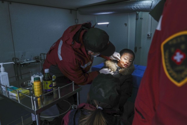 12月19日,在甘肃临夏积石山县大河家镇大河村安置点,甘肃省人民医院的医生在移动手术车上为小朋友清理伤口。新华社记者方欣摄
