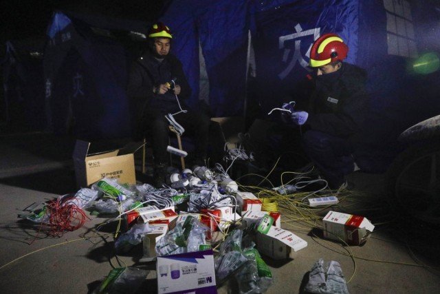12月19日晚,在积石山县大河家镇大河村安置点,国家电网工作人员在做通电前的准备。新华社记者方欣摄