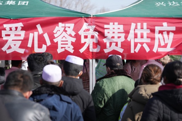 12月20日,在积石山县大河家镇大河村安置点,爱心企业给受灾群众提供免费牛肉面。新华社记者陈斌摄