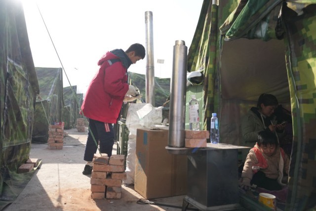 12月20日,在积石山县大河家镇陈家村安置点,受灾群众在帐篷外给炉子添煤。新华社记者陈斌摄