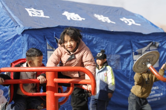 12月20日,在积石山县大河家镇大河村安置点,小朋友在帐篷外做游戏。新华社记者方欣摄